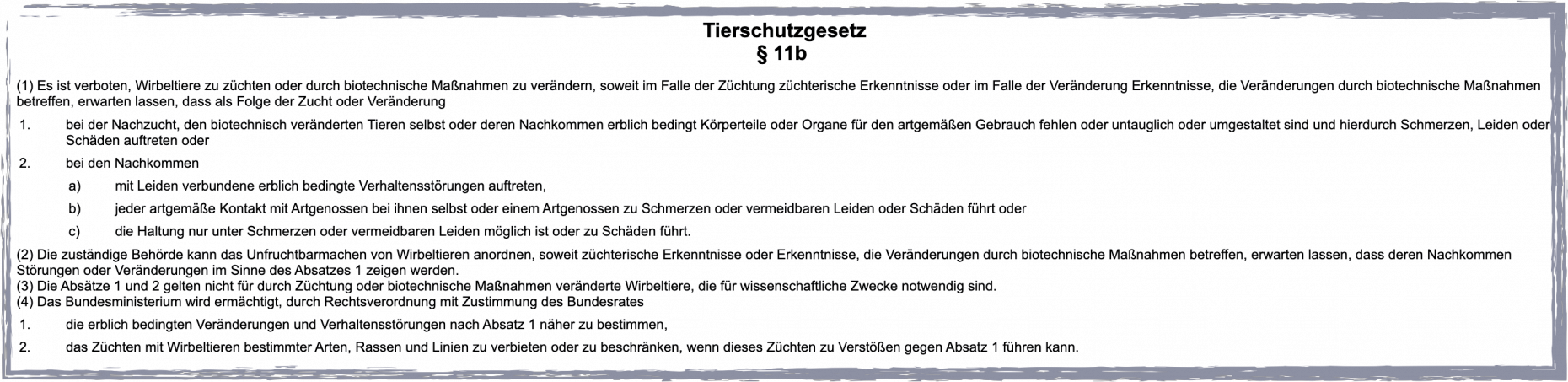 Der Paragraph 11b des Tierschutzgesetz, der Qualzuchten definiert und verbietet, ist leider zu schwammig formuliert und es fehlen konkrete Angaben, an denen man sich orientieren kann, um das Verbot auch umsetzbar zu machen. Genau hier setzen die Bemühungen des Qualzucht Evidenz Netzwerks an. Denn es gibt beratungsresistente Züchter*innen, die genau diese Erbkrankheiten willig in Kauf nehmen. Hier ist mit Argumenten nicht beizukommen – außer dass konkrete Checklisten vorhanden sind, an die (Amts-)Tierärzte und auch Gerichte sich halten können, um das Gesetz auch praktisch anwenden zu können. Es gibt Länder wie die Niederlande, in denen die Produktion kurznasiger Tiere verboten ist – geht doch! Es wurde einfach ganz klar festgelegt, dass die Nasenlänge mindestens ein Drittel der Kopflänge betragen muss, woraufhin der Mopszuchtverband seine Arbeit einstellen musste: Erfolg: Niederlande verbieten die Zucht von Möpsen, peta.de vom 7. Juni 2019. Berlin, bzw. das dortige Verwaltungsgericht, hat ganz klar die Nacktkatze als Qualzucht klassifiziert: „Nacktkatzen ohne Tasthaare sind Qualzucht“, Pressemitteilung vom 23.09.2015.