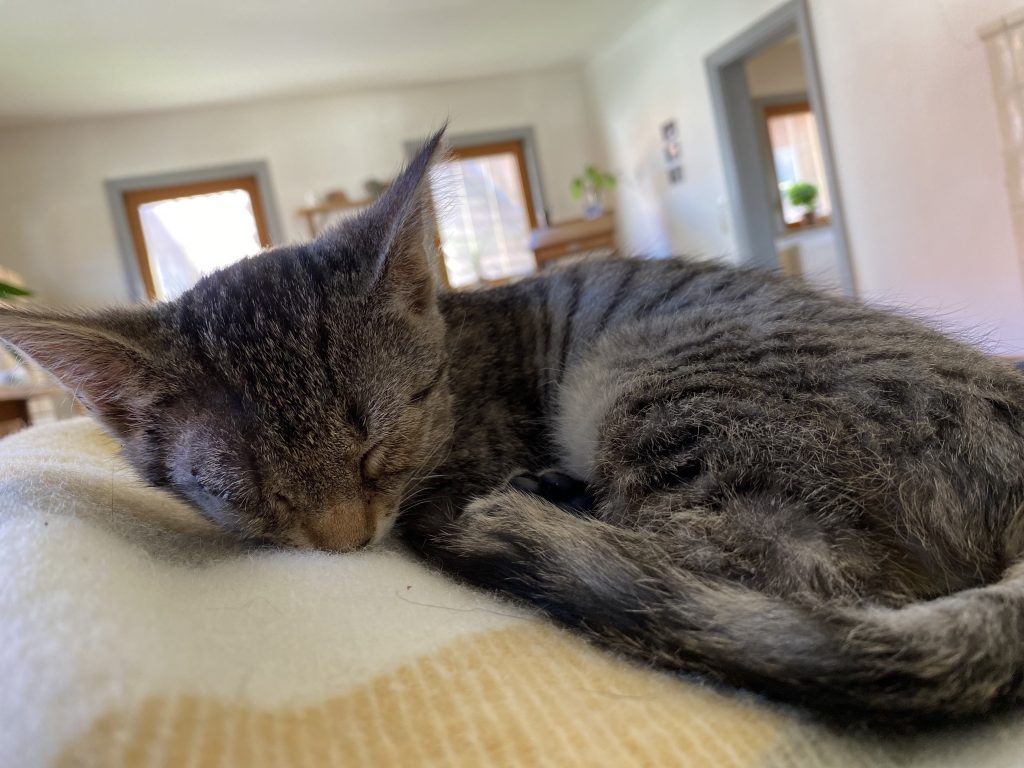 Was dann folgte war eine Nacht, die mich an eine verzweifelte Mutter und ihr Neugeborenes erinnerte, das immerzu schreit und niemand weiß, was zu tun ist. Balu atmete nur noch keuchend und fast schon spastisch zuckend japste er im Wohnzimmer umher. Hildes Nase war in der Nacht derart verstopft, dass weder sie noch ich schlafen konnten. Beide hielten verzweifelt ihre Köpfchen in den Nacken, um so besser Luft zu bekommen. Ätherische Öle sind ein NoGo bei Katzen – vieles ist für sie giftig – so etwas hätte man bei akuter Atemwegsinfektion wohl dem Menschen geholfen – und ich wanderte verzweifelt mit einer keuchend hustenden kleinen Katze durchs Zimmer ohne irgendein hilfreiches Instrument, das Linderung verschafft hätte. Während das andere Kätzchen zuckend schnarchte und immer wieder aufschreckte. Wohlgemerkt in einer Arbeitswoche. Der Wecker klingelte erbarmungslos.