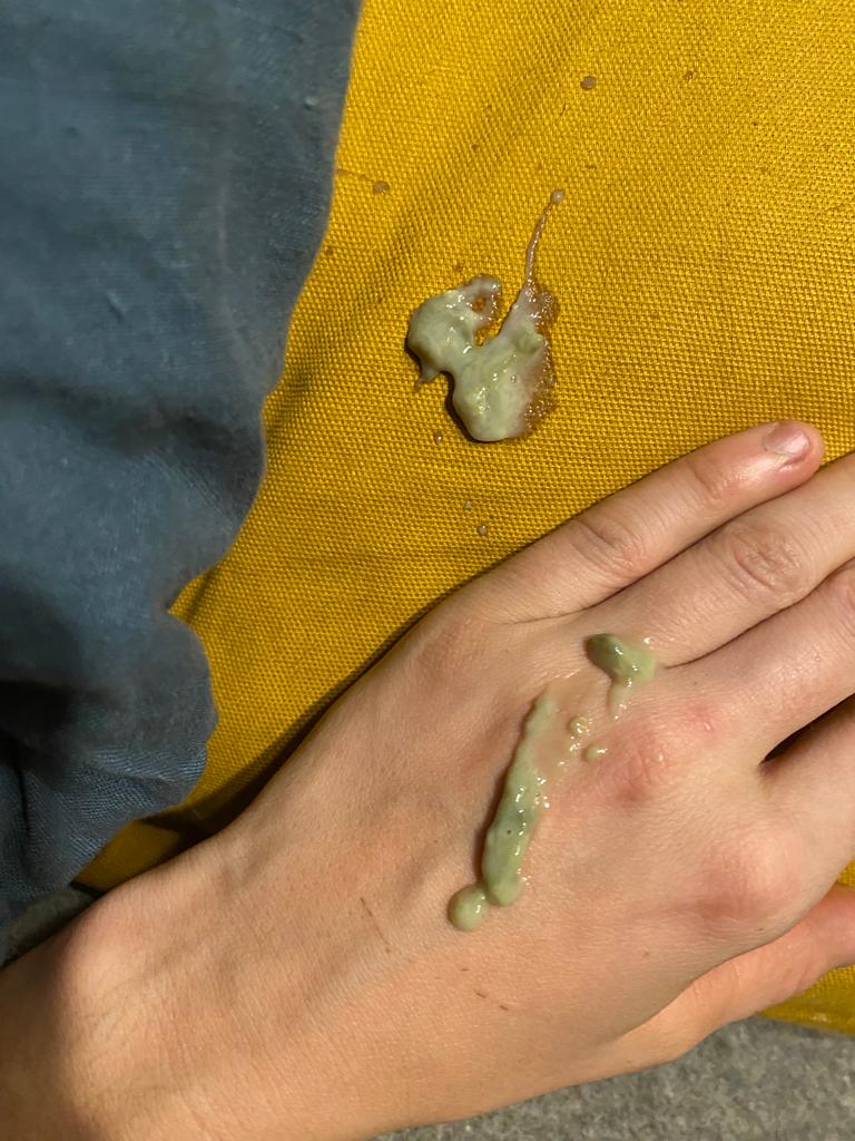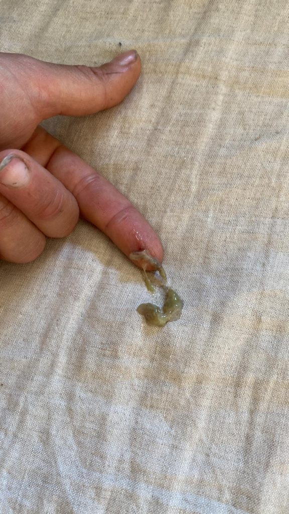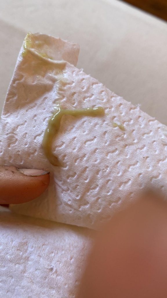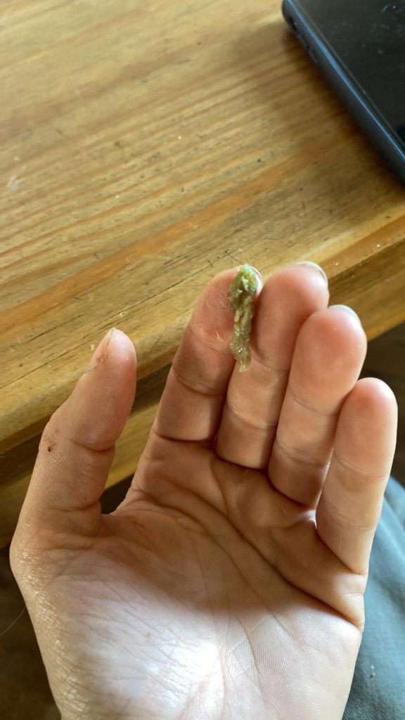 Es war ein mächtiger Popel. Graugrün mit Braun, die ersten 2 cm (!) waren dick, hart, trocken und der hintere Teil bestand aus 5 mm weicherem Material mit Schleim. Die Gesamtlänge bemaß zwischen 3 und 4 cm und in der Breite war er 5-7 mm dick. Ein Brontosaurier-Popel. Und – Überraschung! – der Kater atmete normal. Mit der Geburt dieses Monsters war er von jeglicher Mattigkeit, von jeglichem Kopfweh befreit. Er verhielt sich wie ein normales Katerkind. Und schien zudem sichtlich erleichtert. Wen wundert’s?